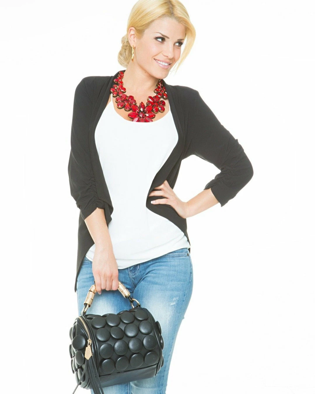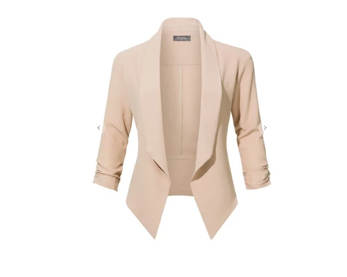 For the women who dresses for comfort and style this blazer is for you. Featuring a draped front, quarter sleeve, and semi-cropped fit at back. Wear with jeans and a tee shirt for a more cute- casual look or layer over a simple day dress for more style and detail.