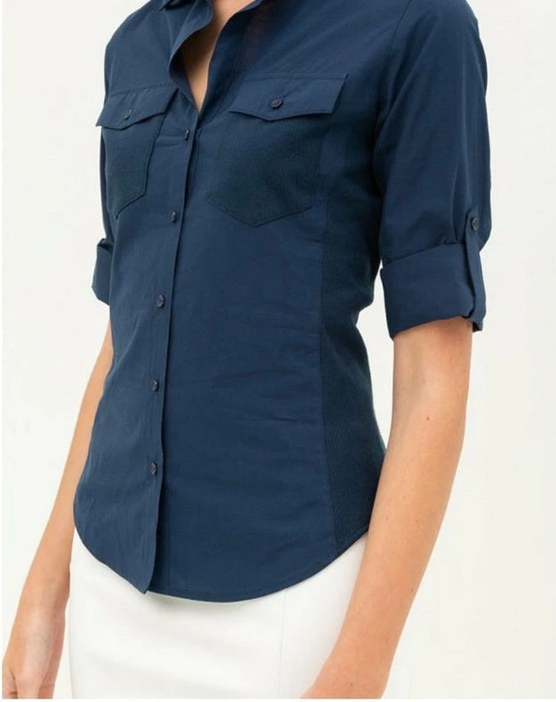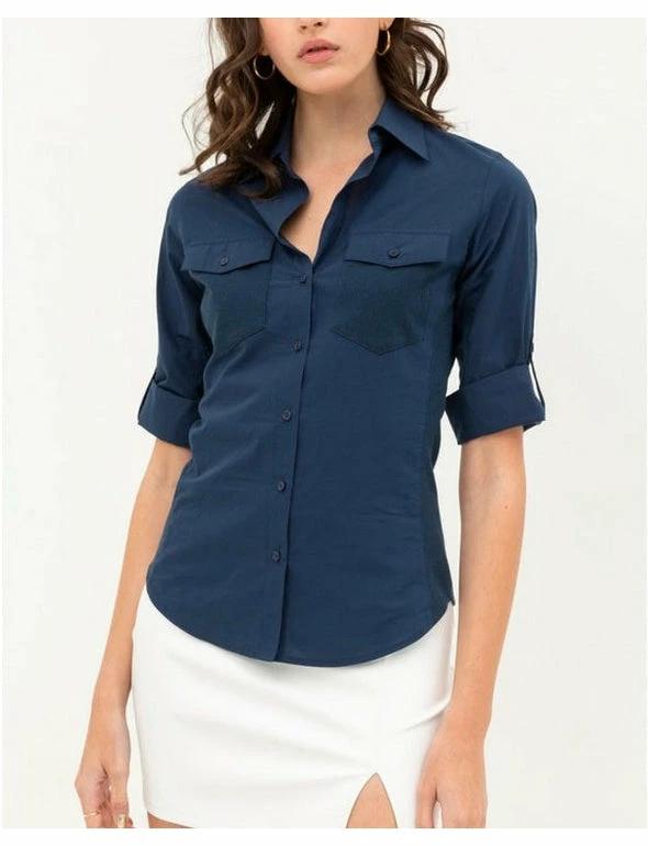 This top features button up collard top with pockets,
