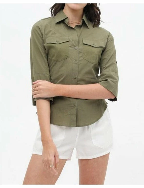 This top features button up collard top with pockets,