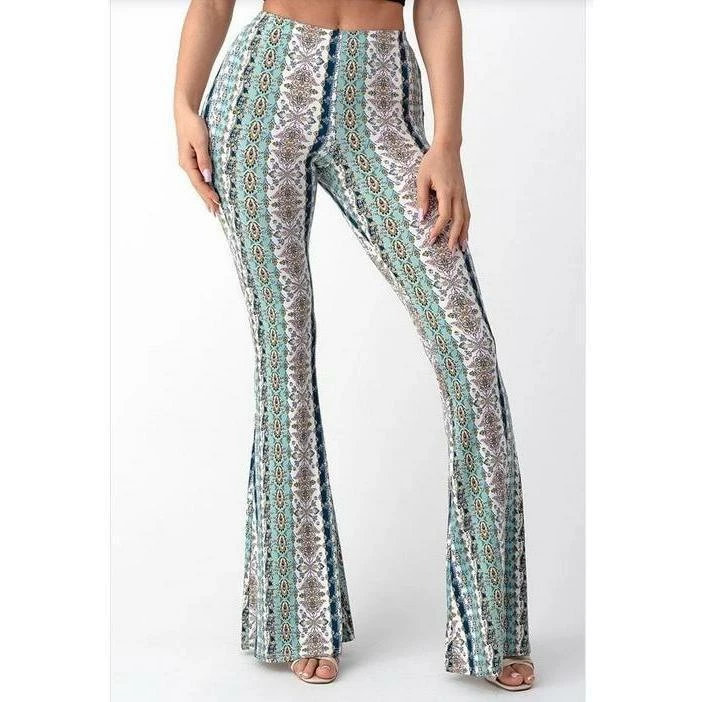 Have legs for days in this paisley, high rise, fitted, bell-bottom pants with an elastic waistband. This comfortable stylish pant is great with