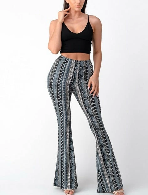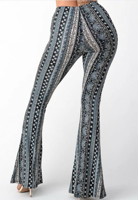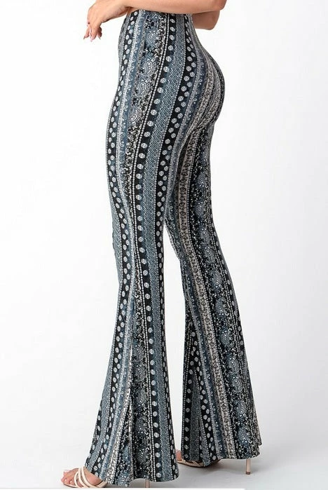 Have legs for days in this paisley, high rise, fitted, bell-bottom pants with an elastic waistband. This comfortable stylish pant is great with