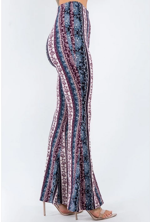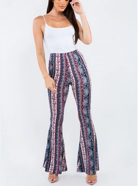 Have legs for days in this paisley, high rise, fitted, bell-bottom pants with an elastic waistband. This comfortable stylish pant is great with