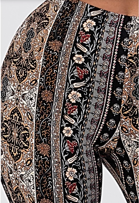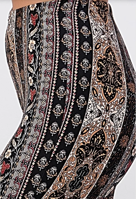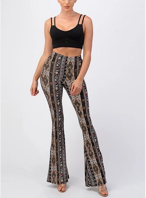 Have legs for days in this paisley, high rise, fitted, bell-bottom pants with an elastic waistband. This comfortable stylish pant is great with