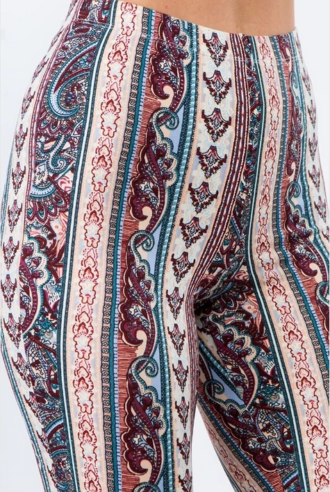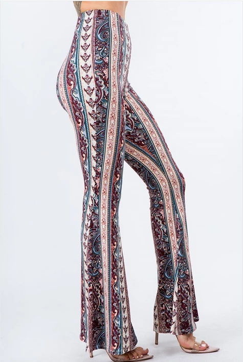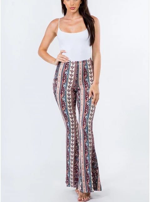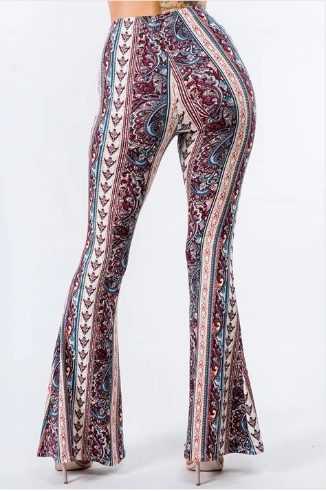 Have legs for days in this paisley, high rise, fitted, bell-bottom pants with an elastic waistband. This comfortable stylish pant is great with