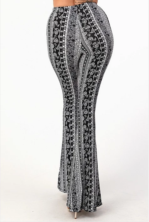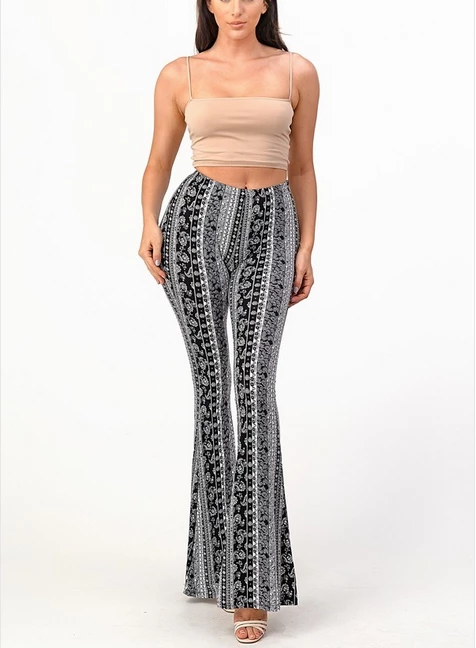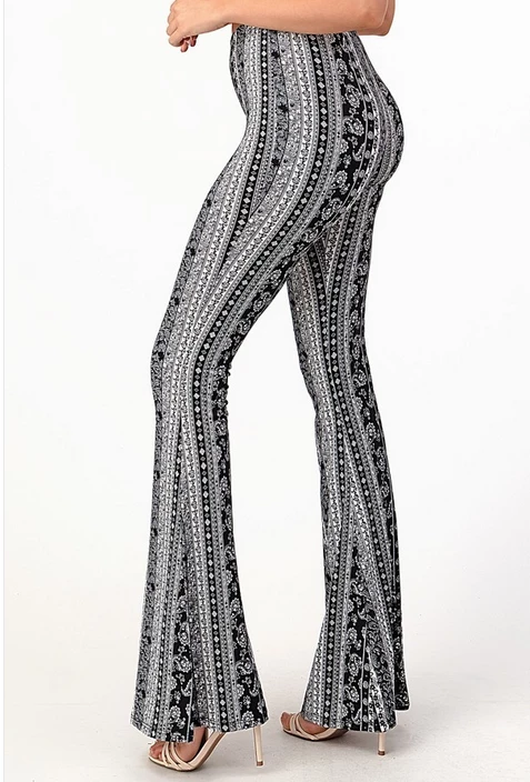 Have legs for days in this paisley, high rise, fitted, bell-bottom pants with an elastic waistband. This comfortable stylish pant is great with