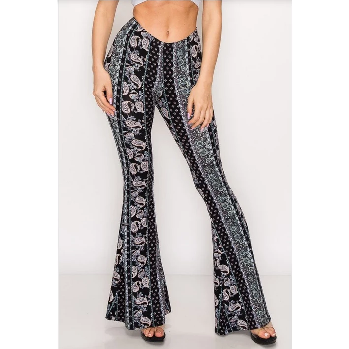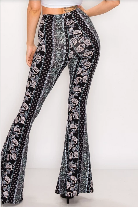 Have legs for days in this paisley, high rise, fitted, bell-bottom pants with an elastic waistband. This comfortable stylish pant is great with