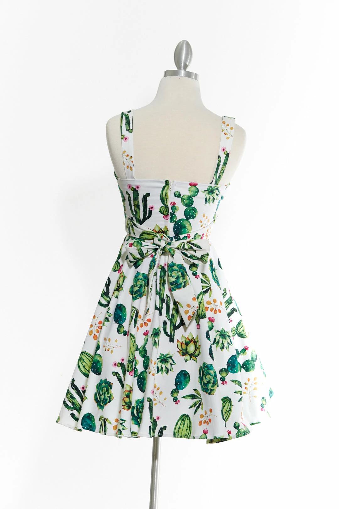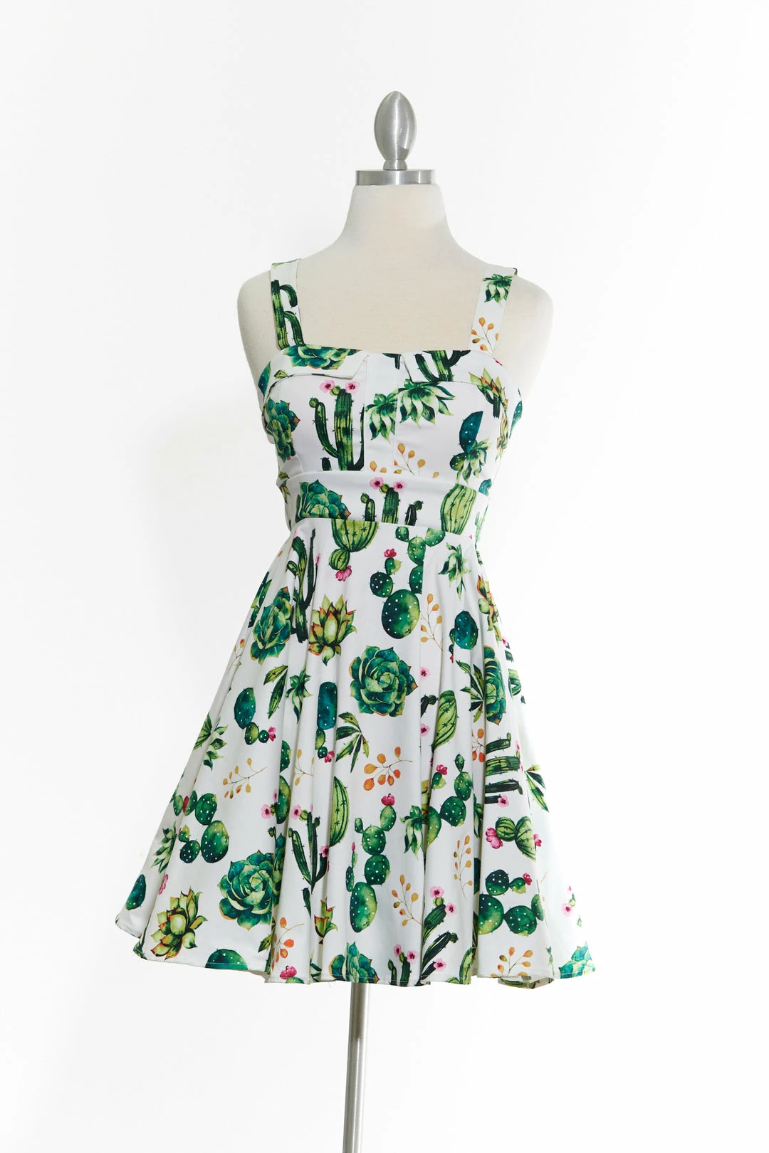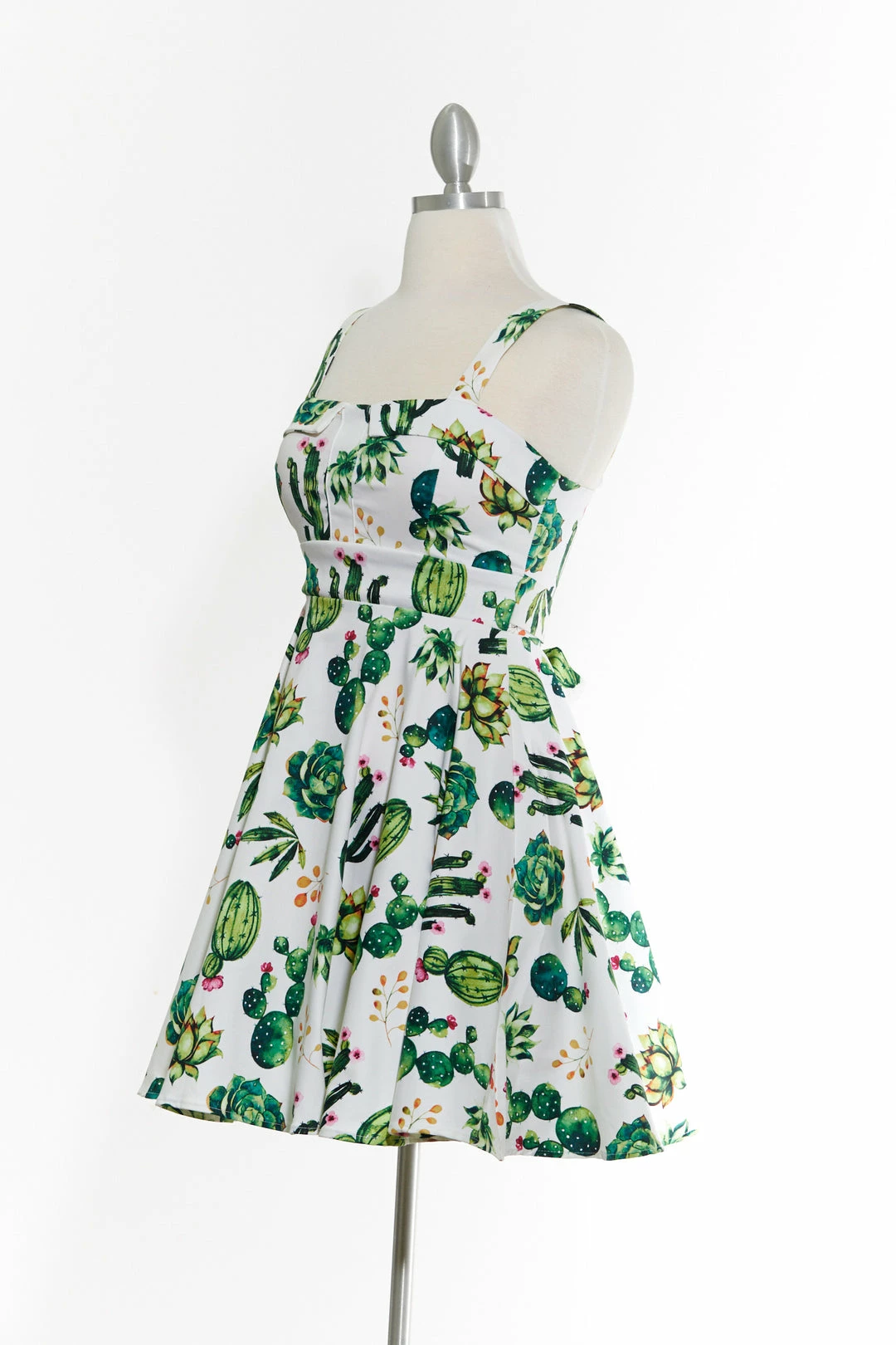 Keep smiling because life is a beautiful thing’ and so is this classic pinup style dress. This cute white with cactus print dress has thick straps for an extra bit of support atop the fitted bodice that culminates into an adorable rounded skirt. The Marilyn dress ties in the back to fit to all of our beautiful body types. This dress is versatile just like the modern woman – wear it to work or wear it to play!