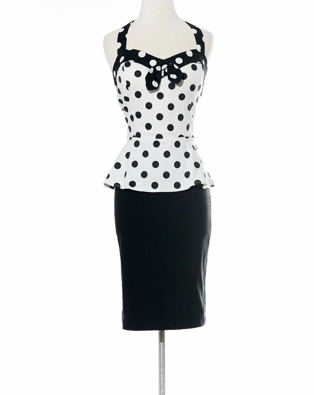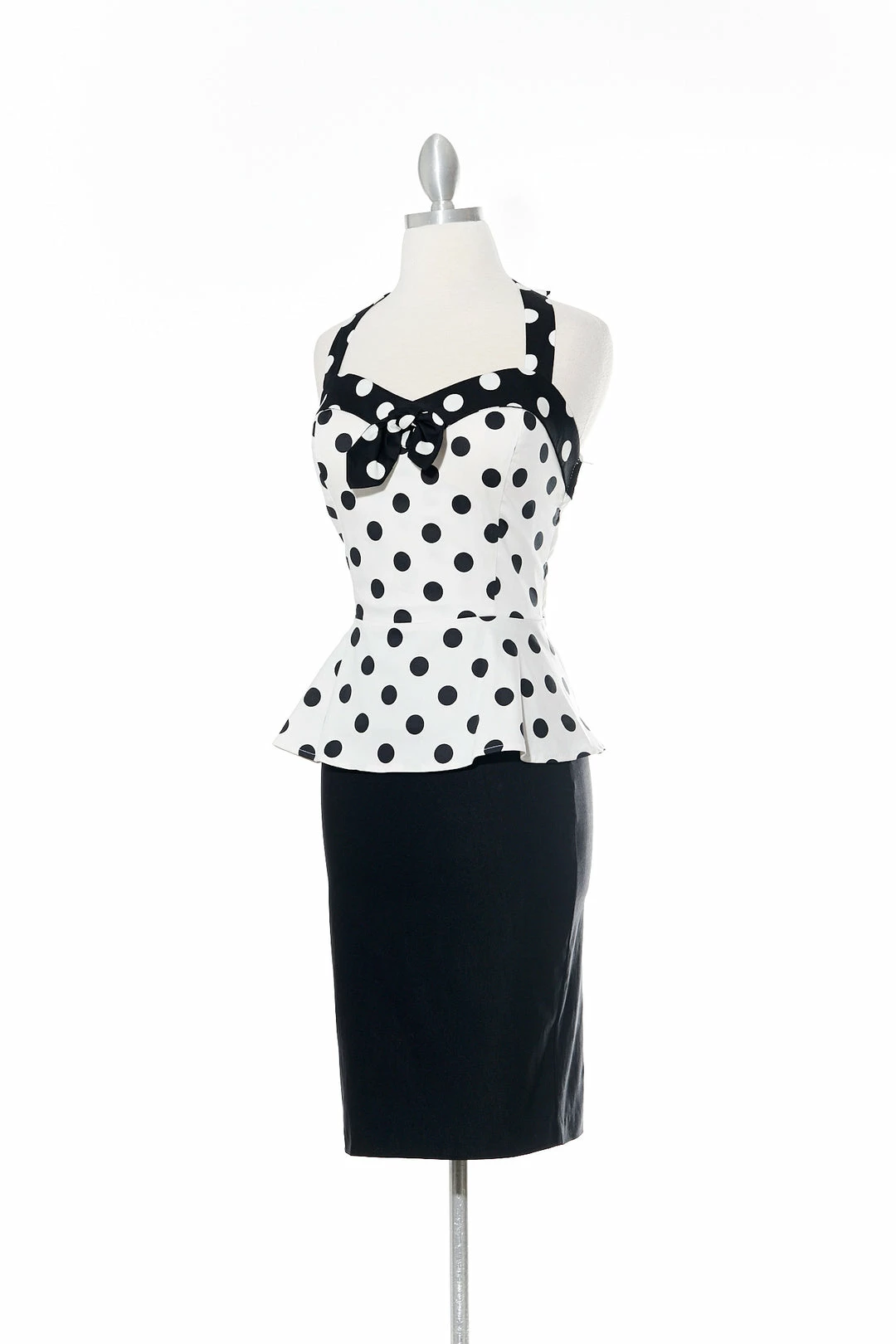Check out this beautiful vintage halter top featuring black polka dots and a small bow around the bust area.