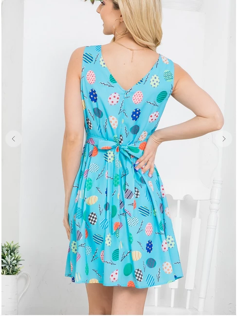 a colorful print of eggs the perfect dress for Easter or Spring. This chiffon material