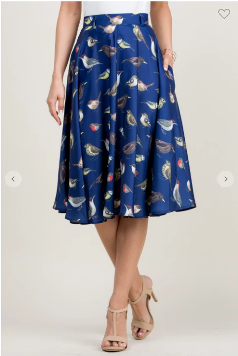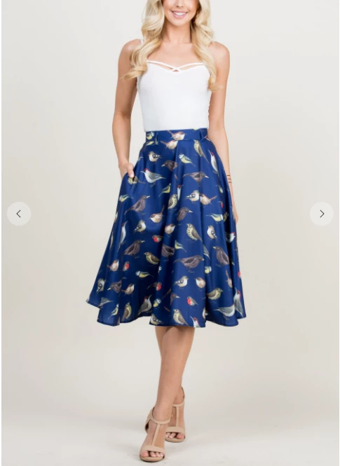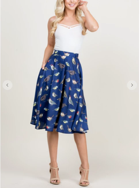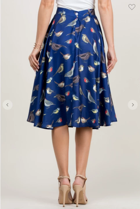 A sweet silhouette, darling! Crafted in a fabulous blue light weight material , this adorable fit and flare skirt features a delightful bird print throughout for those who still believe in magic.