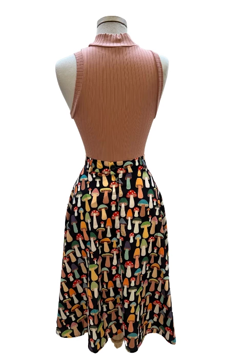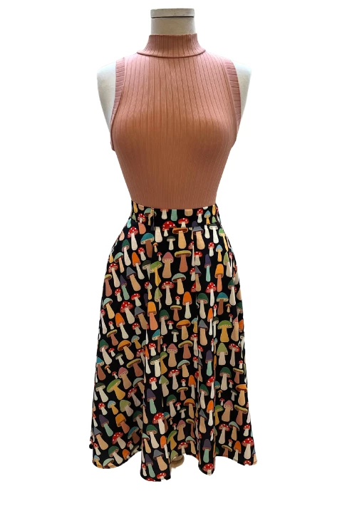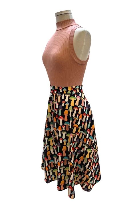 A sweet silhouette, darling! Crafted in a fabulous light weight material this adorable fit and flare skirt features a delightful mushroom print throughout for those who still believe in magic.