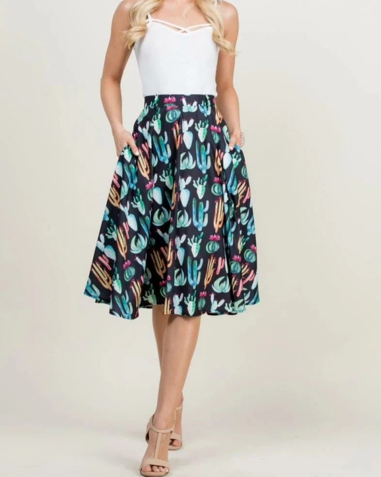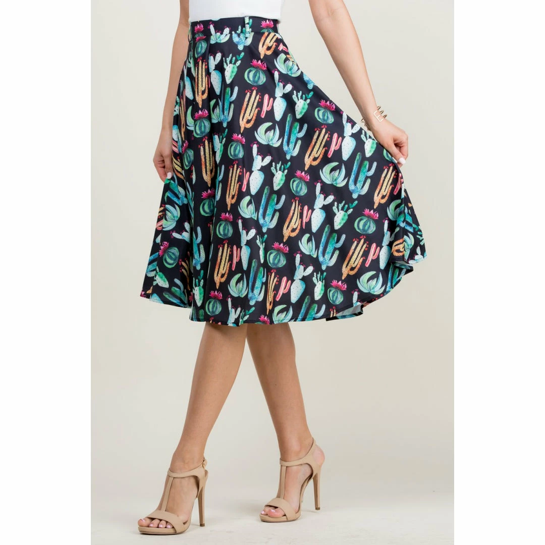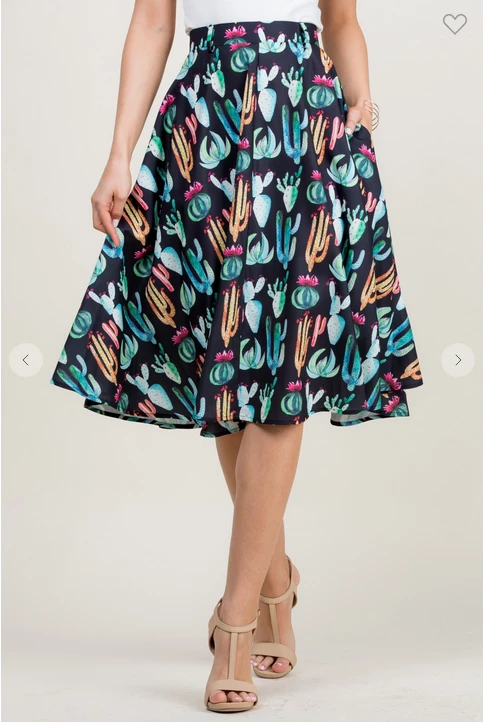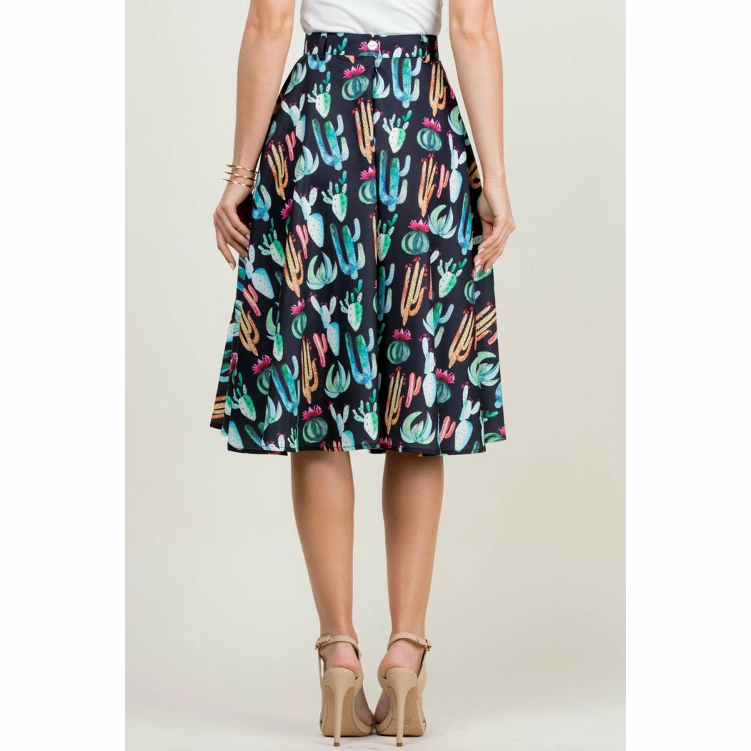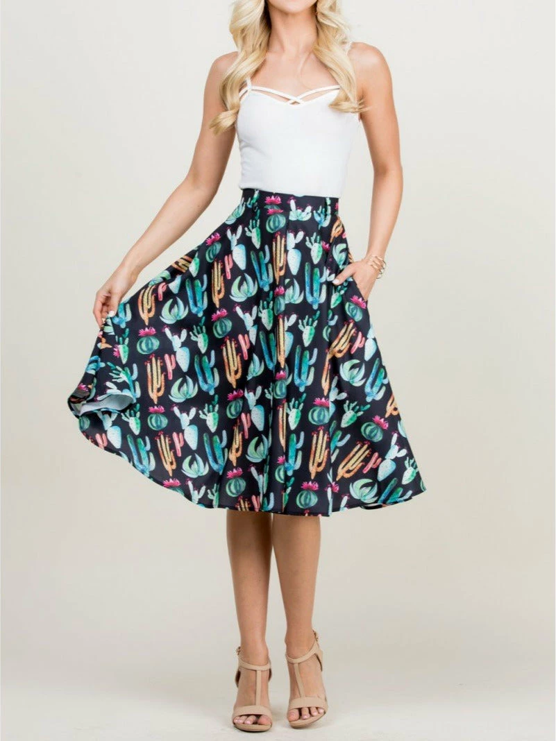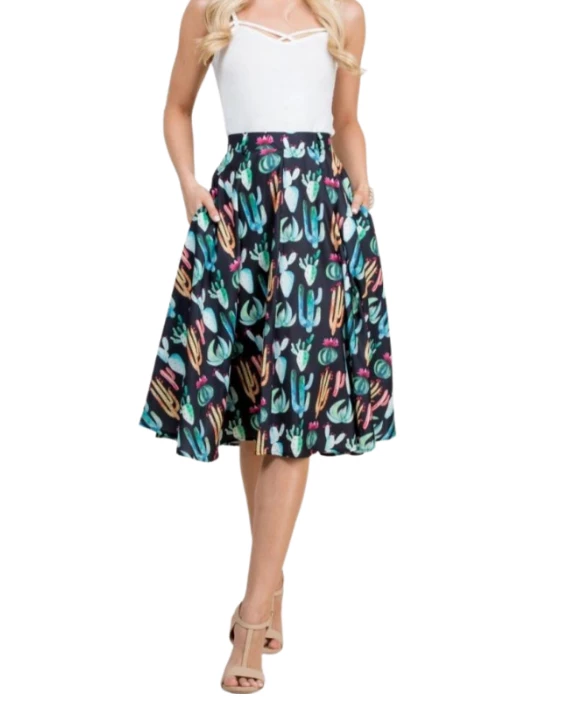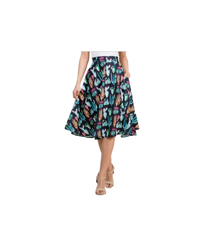 A sweet silhouette, darling! Crafted in a fabulous light weight material, this adorable fit and flare skirt features a delightful cactus print throughout for those who still believe in magic.