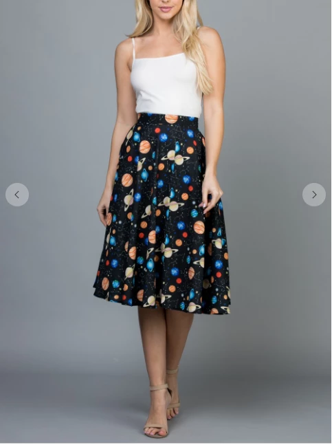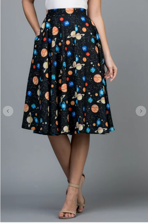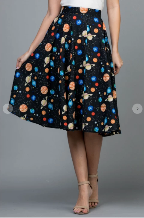 A sweet silhouette, darling! Crafted in a fabulous light weight material, this adorable fit and flare skirt features a delightful planet print throughout for those who still believe in magic.
