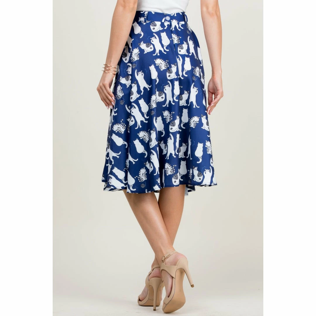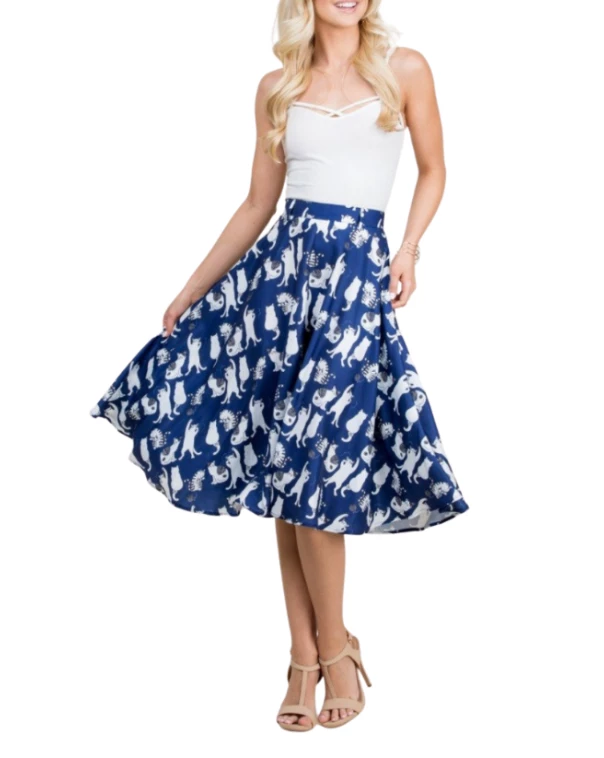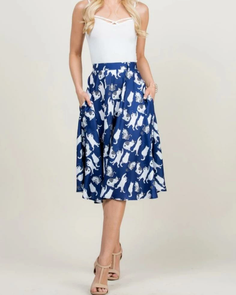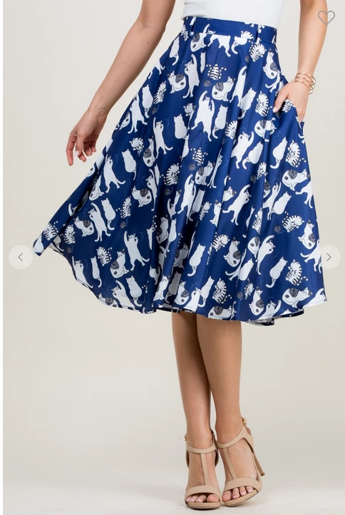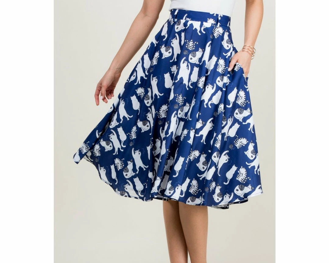 A sweet silhouette, darling! Crafted in a fabulous light weight material, this adorable fit and flare skirt features a delightful kitty print throughout for those who still believe in magic.