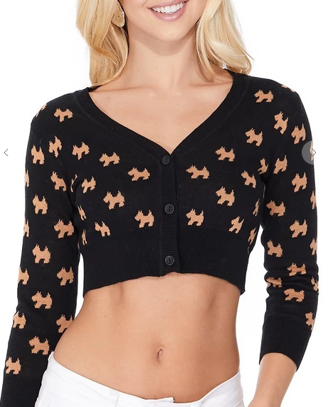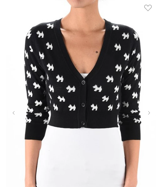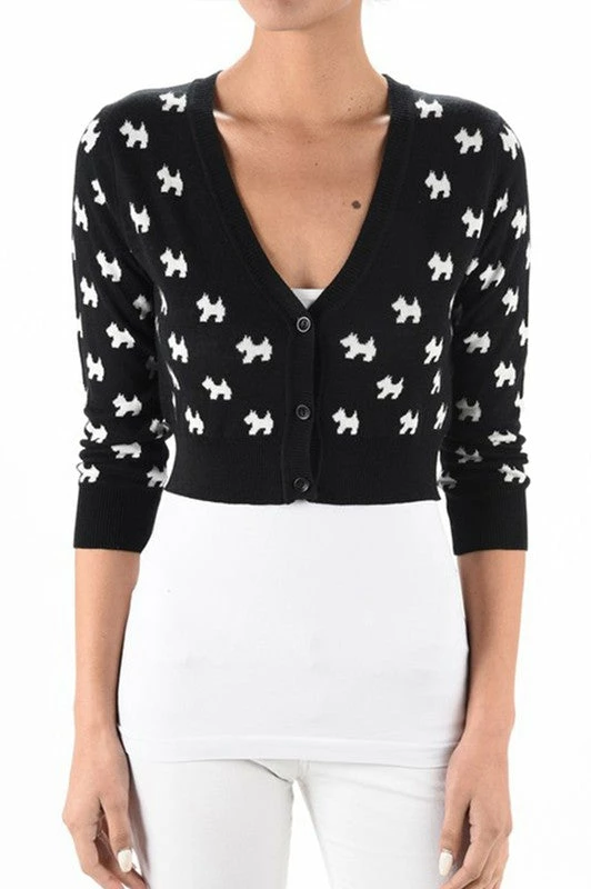 Round neck knit cardigan sweater with adorable white print all over and 3 little black buttons on the front.