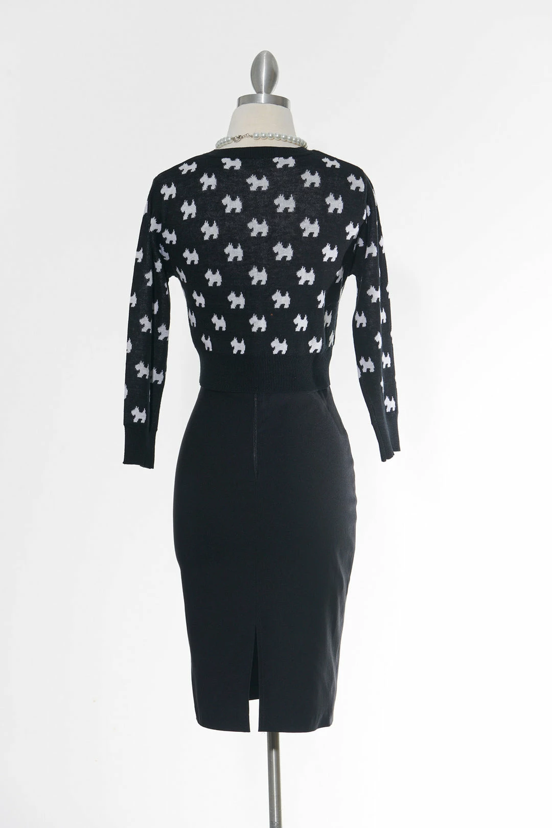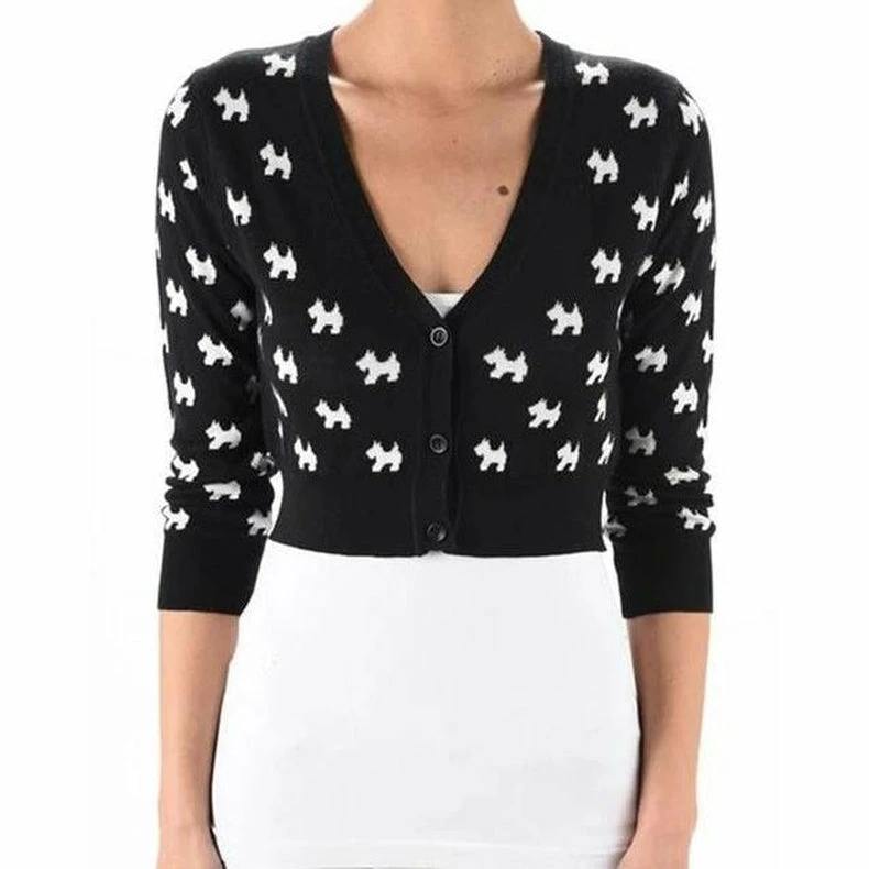 Round neck knit cardigan sweater with adorable white print all over and 3 little black buttons on the front.