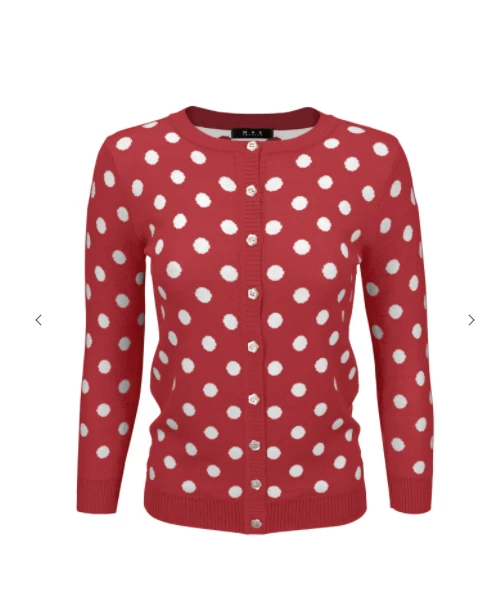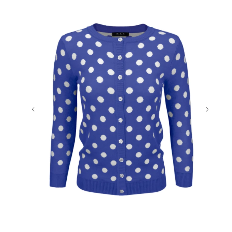 in your closet. This polka dot print cardigan has a classic