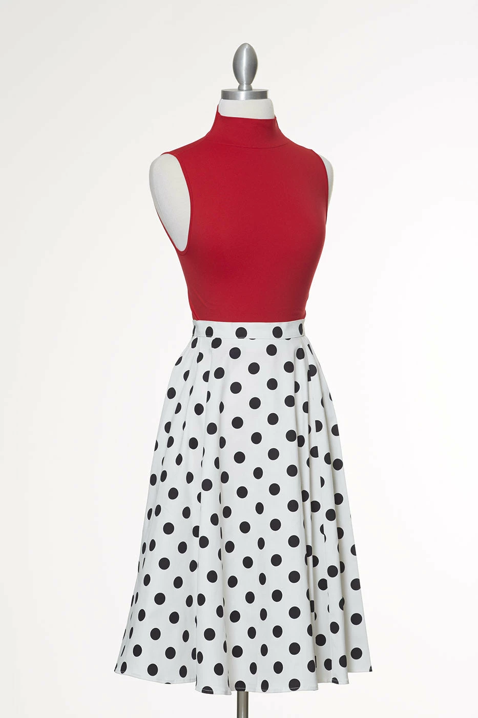 A true Varga fav, Polka Dots! A sweet little number with fashionable pleats, this cotton-blend beauty definitely deserves a spot in your closet. Wonderfully covered with polka dots, high-waisted, midi-length silhouette, this A-line is a true must have!