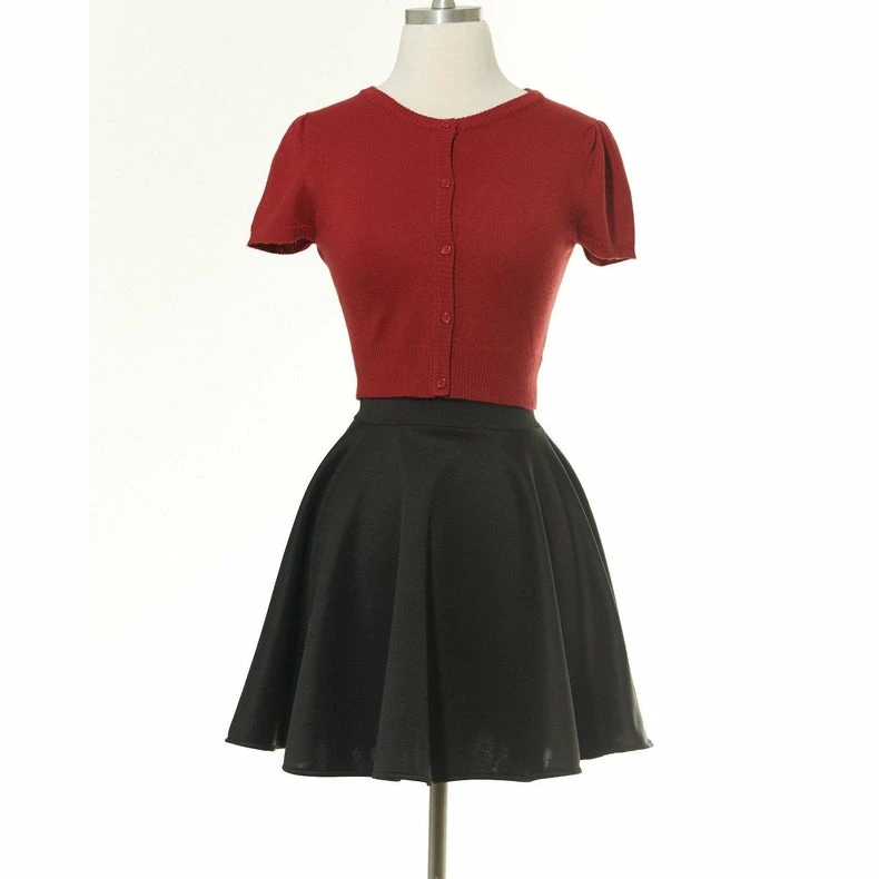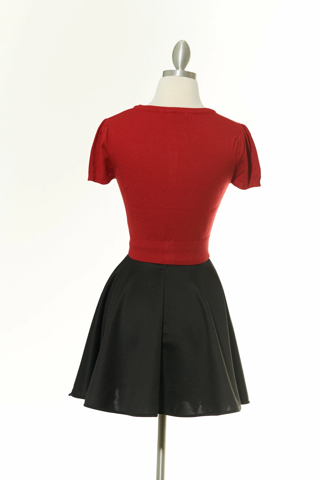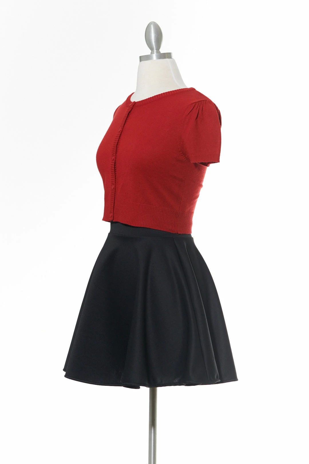 A retro classic that pairs perfectly with modern ensembles. This soft and stretchy red cardigan features a cropped design that combines with a scoop neck, short cap sleeves and a button row up front to create a prim and polished look.